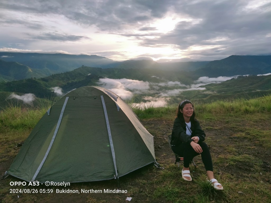 While waiting for his arrival, I had a little chat with the campers who camped at Panimahawa Ridge that night. Someone offered to take a few photos of me so that I will have photos on my own. He even showed me, Mt. kulago and RotyPeaks Ridge Camp from Panimahawa Ridge (thank you Sir, and I left without saying goodbye, haha). He said “Strike a pose near our tent, so that you will have a photo of you with a tent.” Even lend me a chair. I was laughing and really thankful and grateful for their kindness.