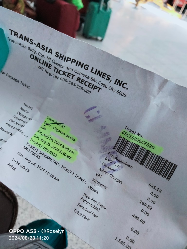 TransAsia Shipping Lines operates Mondays to Saturdays (Cebu-Cagayan-Cebu). I arrived at Pier 3 Cebu 2 hours before my scheduled departure which was 8 PM. I also chose tourist because I’m quite sensitive with crowded places, I needed to sleep well because I will be trekking and doing lots of minor activities in Bukidnon the day after.